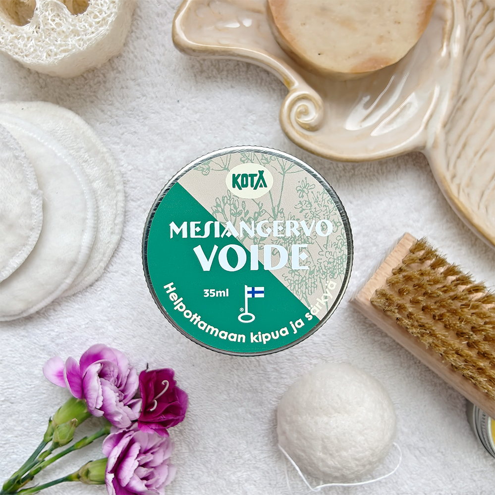 Hunajaisen kukkaistuoksuinen hoitovoide vartalon iholle ja hierontaan. Voide pehmentää ja hoitaa ihoa sekä sopii erityisesti lihasten ja nivelalueiden hierontaan. Mesiangervo tunnetaan perinteisesti rohdoskasvina, jota on käytetty helpottamaan kipua ja särkyä sekä lihasten rasitustilojen yhteydessä. Voide sopii hyvin käytettäväksi esimerkiksi liikunnan jälkeen tai jännittyneille lihaksille hieronnan yhteydessä. Kokeile myös purentalihaksille!